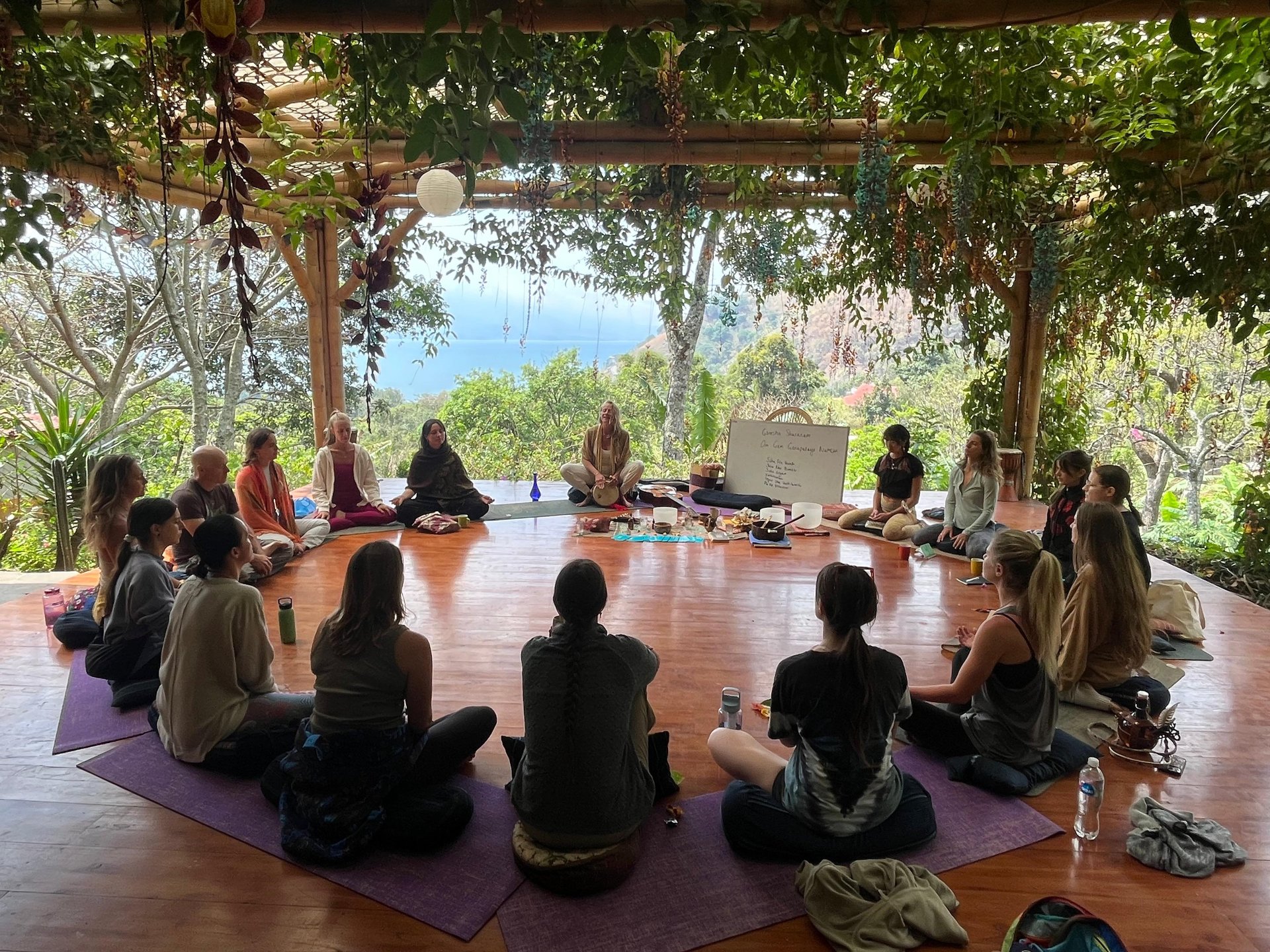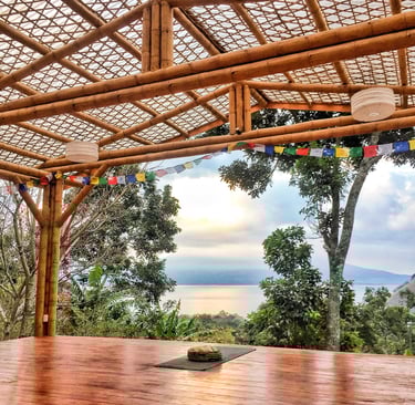 The platform, or "Shala", at Casa Kula is an open air wood and bamboo structure with stunning views of Lake Atitlan. It can comfortably hold 20 people for movement practices